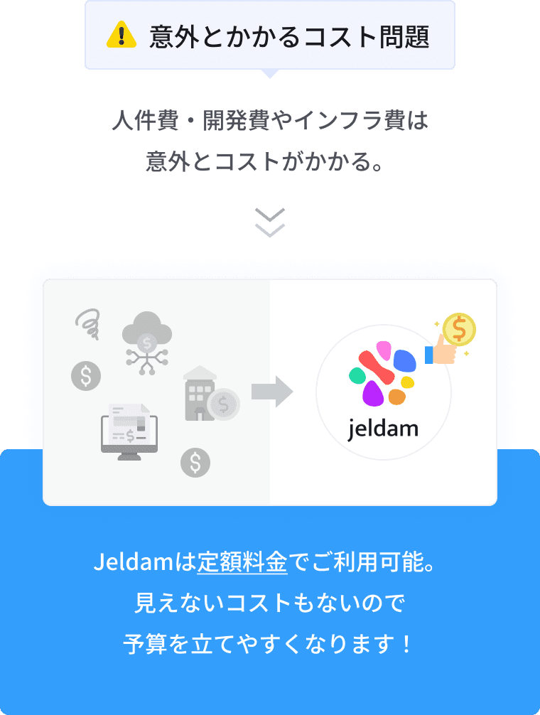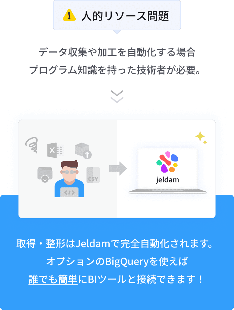 横持ちデータは分析や機械学習でのひと手間必要となり大変。Jeldamでは、徹底して縦持ちデータ整形します。非構造化データも構造化して提供するため、より扱いやすくなります。
