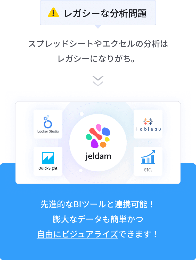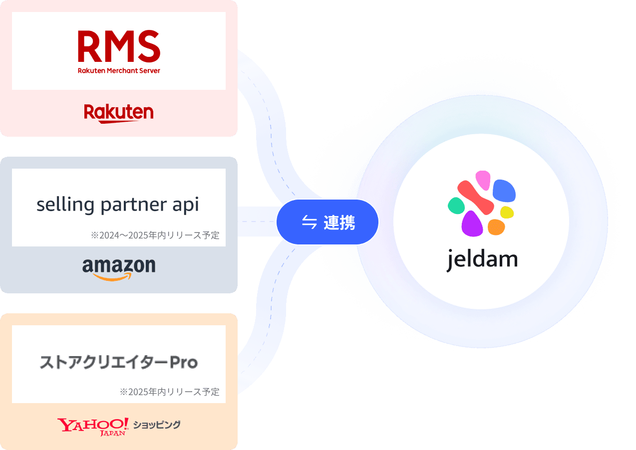 Jeldamでは、様々なECプラットフォームからのデータを自動で収集・保管し、分析までのフローを最適化します。